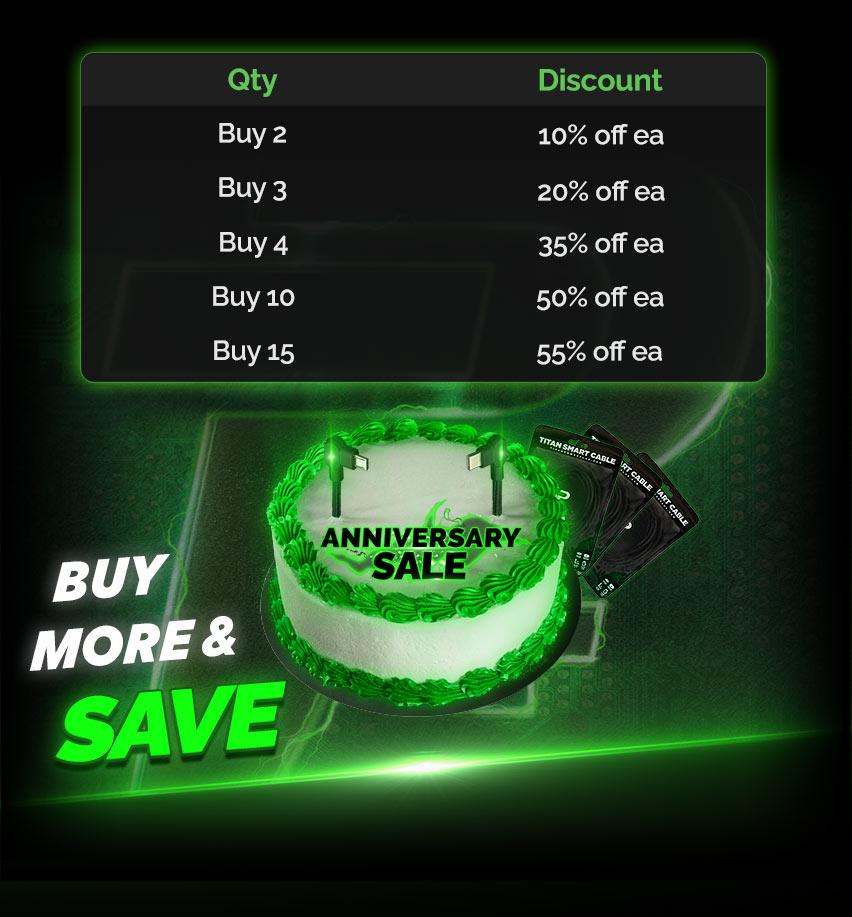 You didn't forget it was our anniversary did you?! Of course not! To thank you all for your titanic support, we're dropping our best selling Titan Smart Cable by an insane 60%!