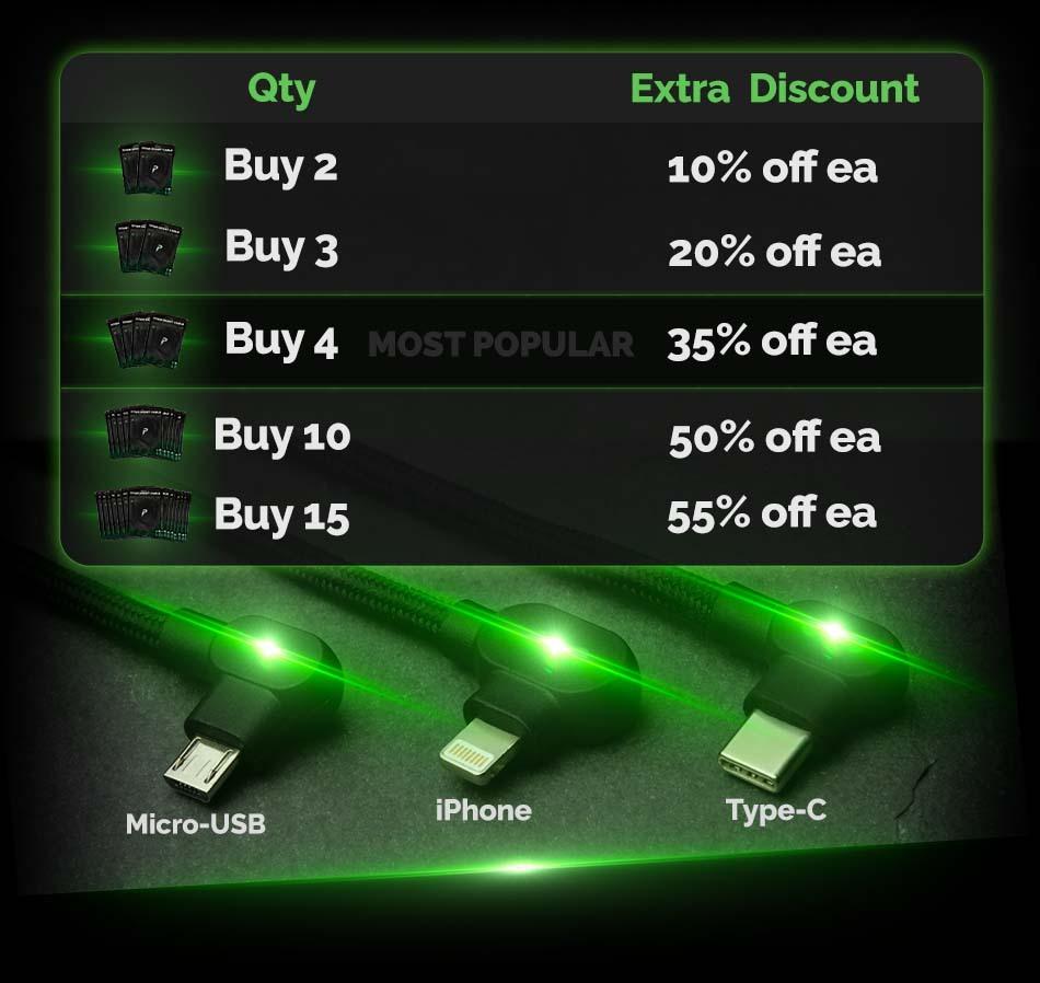 Bending leads to failure, our 90° head prevents bending! Resulting in a lifetime cable that does not fray or wear under common use. With the right angle design, this cable will never get in the way when holding and charging.