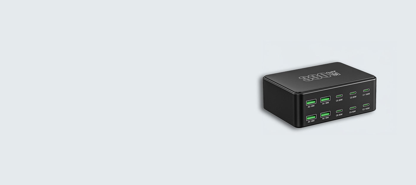 One station. Ten ports. 330 watts. Charge your laptop, phone, tablet, watch, and earbuds — all at once, from a single outlet.